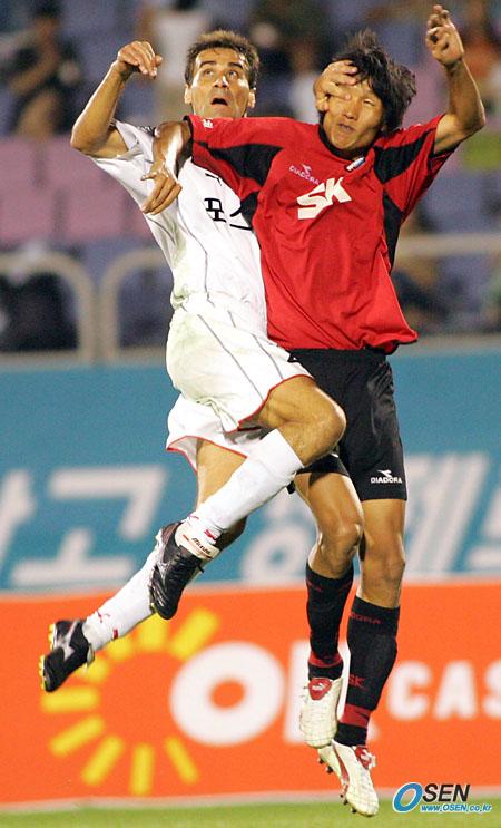 11일 부천 종합운동장에서 벌어진 부천 SK와 포항 스틸러스의 경기 후반 포항의 산토스(왼쪽)가 헤딩을 시도하면서 왼손으로 부천 고기구의 오른쪽 눈을 가리며 점프하고 있다./부천=주지영 기자 jj0jj0@osen.co.kr [Copyright ⓒ OSEN(www.osen.co.kr) 무단전재 및 재배포 금지]