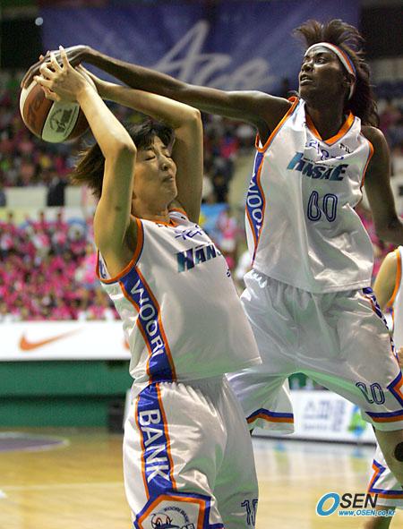 12일 서울 장충체육관에서 벌어진 신한은행배 2005 여자프로농구 여름리그 4강 플레이오프 3차전서 우리은행의 크롤리가 리바운드를 노리다 동료 홍현희(왼쪽)가 먼저 잡아낸 리바운드 볼을 건드리고 있다./장충체=주지영 기자 jj0jj0@osen.co.kr [Copyright ⓒ OSEN(www.osen.co.kr) 무단전재 및 재배포 금지]