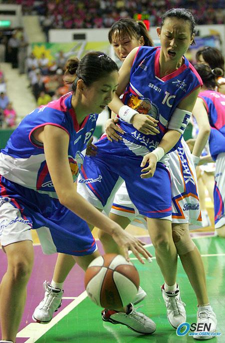 12일 서울 장충체육관에서 벌어진 신한은행배 2005 여자프로농구 여름리그 4강 플레이오프 3차전서 삼성생명의 박연주가 팀 동료 변연하가 우리은행 김은혜의 접근을 몸으로 막아 주는 사이 볼을 잡아내고 있다./장충체=주지영 기자 jj0jj0@osen.co.kr [Copyright ⓒ OSEN(www.osen.co.kr) 무단전재 및 재배포 금지]