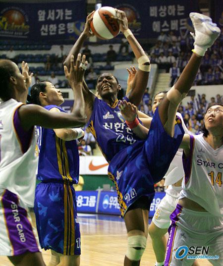 12일 서울 장충체육관에서 벌어진 신한은행배 2005 여자프로농구 여름리그 4강 플레이오프 3차전서 국민은행에 56-53으로 역전승, 2승 1패로 챔피언 결정전에 오른 신한은행의 겐트(가운데)가 리바운드를 잡으면서 몸이 뒤로 젖혀지는 순간 왼발을 높이 들고 있다./장충체=주지영 기자 jj0jj0@osen.co.kr [Copyright ⓒ OSEN(www.osen.co.kr) 무단전재 및 재배포 금지]