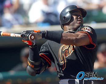 배리 본즈(41.샌프란시스코)가 돌아왔다. 호쾌한 스윙과 정교한 선구안 등 그 모습 그대로다. 13일(한국시간) SBC파크에서 펼쳐진 샌디에이고 파드리스와 홈 경기에 4번 타자-좌익수로 올시즌 처음으로 출장한 본즈는 2회말 선두타자로 첫 타석에 나서 샌디에이고 선발 애덤 이튼을 상대로 좌중간 담장 상단을 맞고 스탠드로 넘어가는 2루타를 터뜨렸다. 펜스의 맨 끝부분을 맞았지만 관중석이 손을 내밀어 공이 넘어가 인정 2루타가 선언됐다. 근 1년만의 메이저리그 실전 출장인데도 본즈는 전혀 다름없는 파워와 선구안을 과시했다. 이튼의 92~94마일 빠른 공에도 전혀 배트가 밀리지 않고 파울을 5개나 걷어냈고 결국 2-3 풀카운트에서 11구째 바깥쪽 낮게 흐르는 93마일짜리 빠른 공을 밀어쳐 담장까지 날아가는 큼지막한 타구를 날렸다. '본즈 효과'는 즉각적이었다. 선발 투수 케빈 코레이라의 난조로 1회 3점을 내주고 시작한 샌프란시스코는 2회 본즈의 선제 2루타가 촉매가 돼 두 점을 따라붙었다. 레이 더램이 적시타로 본즈를 홈으로 불러들였고 에드가 알폰소의 연속안타에 이은 더블 플레이 때 더램도 홈을 밟았다. 샌프란시스코는 4회 더램의 동점 솔로홈런에 이어 알폰소의 2루타, 마이크 머티니의 적시타로 4-3로 뒤집기에 성공했다. 2회 코레이라를 구원 등판한 맷 킨니가 5⅔이닝 무실점으로 한점차 승리를 지켜냈다. 본즈는 3회 2사 1,3루에서 맞은 두번째 타석에선 이튼의 바깥쪽 커브에 배트를 냈지만 얕은 중견수 플라이에 그쳐 타점을 올리진 못했다. 5회 세번째 타석에선 이튼의 빠른 공에 전광석화처럼 반응, 워닝 트랙 앞까지 날아가는 큼지막한 타구를 날리기도 했다. 7회엔 루디 세아네스와 풀카운트 승부를 벌인 끝에 낮은 체인지업에 헛스윙 삼진을 당했다. 4타수 1안타 1득점 1삼진. 본즈는 8회초 제이슨 엘리슨으로 교체될 때까지 좌익수 수비도 실책 없이 소화해내며 복귀 첫 경기를 흠없이 마쳤다. 샌디에이고는 3연패에 빠졌다. 이종민 기자 mini@osen.co.kr [Copyright ⓒ OSEN(www.osen.co.kr) 무단전재 및 재배포 금지]