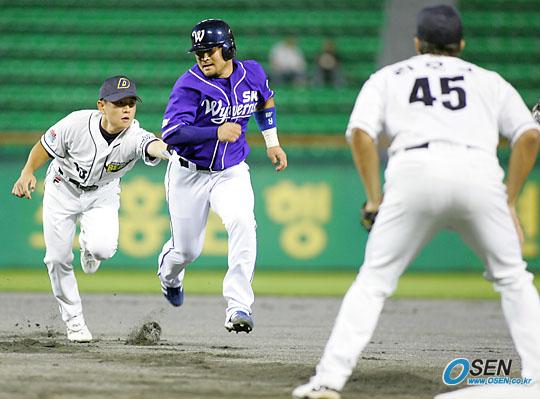 14일 두산 베어스와 SK 와이번스의 잠실 경기 SK의 2회초 1사 1루 김태균 타석 때 1루 주자 정경배가 크게 리드 하고 있다가 두산 포수 홍성흔의 견제구로 1루와 2루 사이에서 협격에 걸려 유격수 손시헌에게 태그 아웃되고 있다./잠실=주지영 기자 jj0jj0@osen.co.kr [Copyright ⓒ OSEN(www.osen.co.kr) 무단전재 및 재배포 금지]
