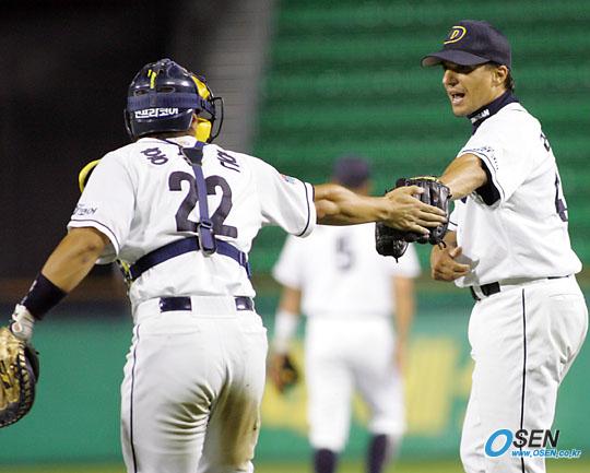 14일 두산 베어스와 SK 와이번스의 잠실 경기서 완투승을 거둔 두산의 리오스와 포수 홍성흔이 경기 후 기뻐하며 글러브를 마주치며 기뻐하고 있다./잠실=주지영 기자 jj0jj0@osen.co.kr [Copyright ⓒ OSEN(www.osen.co.kr) 무단전재 및 재배포 금지]