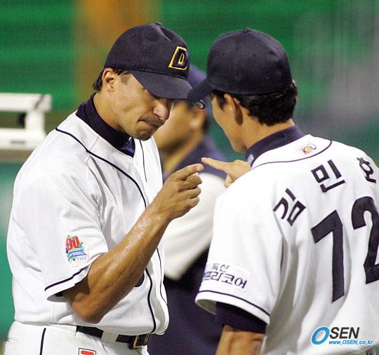 14일 두산 베어스와 SK 와이번스의 잠실 경기서 완투승을 거둔 두산 선발 투수 리오스가 경기 후 김민호 코치와 집게 손가락을 맞대는 '작은 세리머니'를 갖고 있다./잠실=주지영 기자 jj0jj0@osen.co.kr [Copyright ⓒ OSEN(www.osen.co.kr) 무단전재 및 재배포 금지]