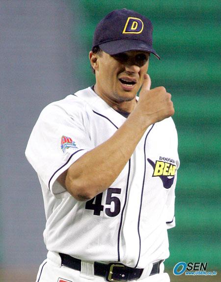 14일 두산 베어스와 SK 와이번즈의 잠실 경기서 두산 선발 투수 리오스가 이닝을 마무리한 뒤 콧등을 엄지로 닦으며 내려오고 있다./잠실=주지영 기자 jj0jj0@osen.co.kr [Copyright ⓒ OSEN(www.osen.co.kr) 무단전재 및 재배포 금지]