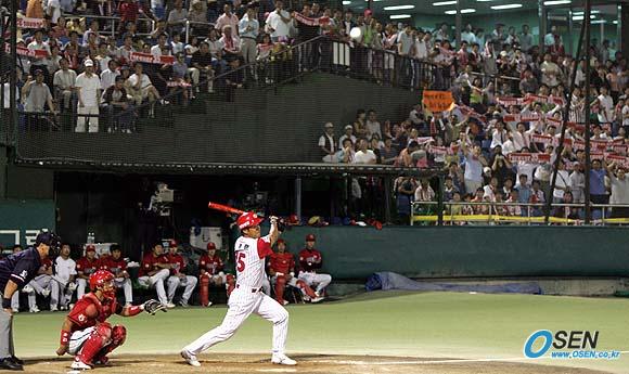 15일 대전구장에서 한화 이글스의 장종훈이 기아 타이거즈를 상대로 은퇴경기를 벌였다. 2회말 1사 1루에서 팬들의 기립박수를 받으며 7번 지명타자로 첫 타석에 나온 장종훈이 힘차게 방망이를 휘두르고 있다. 그러나 첫 타석에서 삼진으로 물러났다. /대전=손용호 기자 spjj@osen.co.kr [Copyright ⓒ OSEN(www.osen.co.kr) 무단전재 및 재배포 금지]