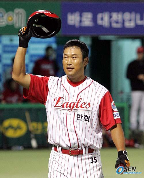 15일 대전구장에서 한화 이글스의 장종훈이 기아 타이거즈를 상대로 은퇴경기를 벌였다. 2회말 1사 1루서 7번 지명타자로 첫 타석에 나온 장종훈이 삼진으로 물러난 뒤 기립박수를 보내는 팬들에게 헬멧을 벗어 인사하고 있다./대전=손용호 기자 spjj@osen.co.kr [Copyright ⓒ OSEN(www.osen.co.kr) 무단전재 및 재배포 금지]