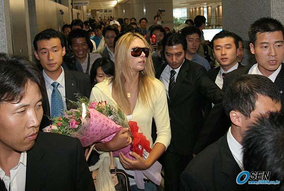 러시아의 '테니스 요정' 마리아 샤라포바가 미국의 비너스 윌리엄스와 오는 19일 서울 올림픽공원 제1체육관(체조경기장) 특설코트에서 '현대카드 슈퍼 매치'를 갖기 위해 16일 오후 인천 국제공항을 통해 내한했다. 입국장을 나선 샤라포바가 경호원 및 대회 관계자들에 둘러싸여 이동하고 있다./인천공항=손용호 기자 spjj@osen.co.kr [Copyright ⓒ OSEN(www.osen.co.kr) 무단전재 및 재배포 금지]