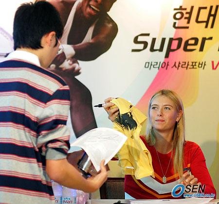 오는 19일 서울 올림픽공원 제1체육관 특설 코트에서 '현대카드 슈퍼 매치'를 벌일 여자 테니스 스타 러시아의 마리아 샤라포바와 미국의 비너스 윌리엄스가 17일 오후 서울 삼성동 현대백화점 무역센터점에서 팬 사인회를 가졌다. 샤라포바가 팬이 준비한 티셔츠에 사인해 주고 있다./주지영 기자 jj0jj0@osen.co.kr [Copyright ⓒ OSEN(www.osen.co.kr) 무단전재 및 재배포 금지]