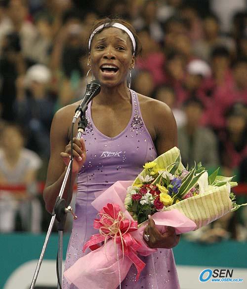 19일 오후 서울 올림픽공원 체조경기장 특설 코트에서 벌어진 세계 여자 테니스 랭킹 1위 마리아 샤라포바(러시아)와 7위 비너스 윌리엄스(미국)의 '현대카드 슈퍼매치' 는 윌리엄스의 2-0 완승으로 끝났다. 비너스가 승리 소감을 얘기하며 활짝 웃고 있다./올림픽공원 체조경기장=손용호 기자 spjj@osen.co.kr [Copyright ⓒ OSEN(www.osen.co.kr) 무단전재 및 재배포 금지]