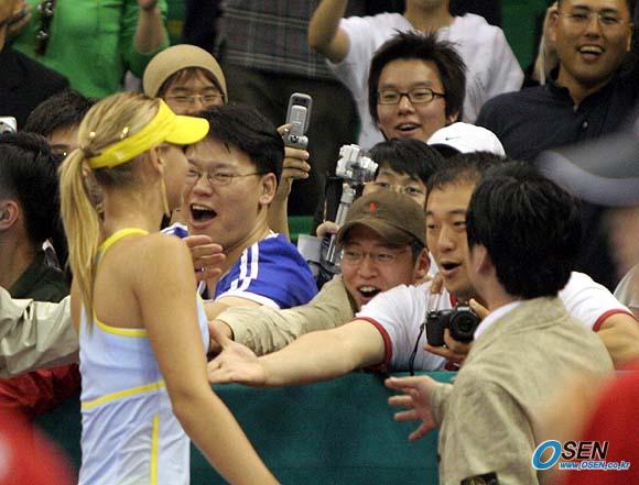 19일 오후 서울 올림픽공원 체조경기장 특설 코트에서 벌어진 세계 여자 테니스 랭킹 1위 마리아 샤라포바(러시아)와 7위 비너스 윌리엄스(미국)의 '현대카드 슈퍼매치' 는 윌리엄스의 2-0 완승으로 끝났다. 경기가 끝난 뒤 샤라포바가 팬들과 악수하며 경기장을 빠져나가고 있다./올림픽공원 체조경기장=손용호 기자 spjj@osen.co.kr [Copyright ⓒ OSEN(www.osen.co.kr) 무단전재 및 재배포 금지]