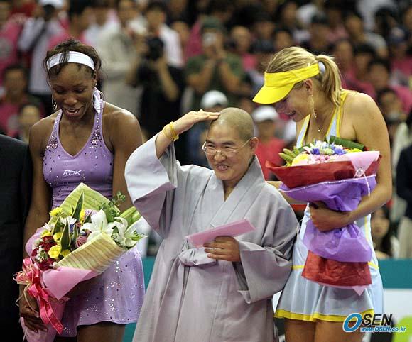 19일 오후 서울 올림픽공원 체조경기장 특설 코트에서 벌어진 세계 여자 테니스 랭킹 1위 마리아 샤라포바(러시아)와 7위 비너스 윌리엄스(미국)의 '현대카드 슈퍼매치' 는 비너스 윌리엄스의 2-0 완승으로 끝났다. 윌리엄스와 샤라포바가 상금 전액을 기부한 보육시설에서 나온 스님이 함께 사진 찍다 '키 차이가 많이 난다'는 제스처를 취하고 있다./올림픽공원 체조경기장=손용호 기자 spjj@osen.co.kr [Copyright ⓒ OSEN(www.osen.co.kr) 무단전재 및 재배포 금지]