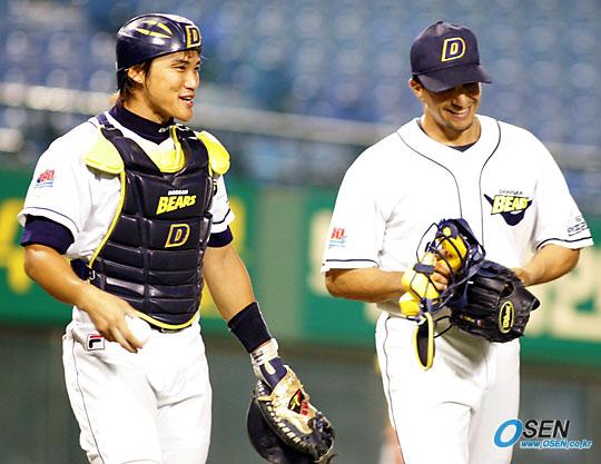 20일 두산 베어스와 현대 유니콘스의 잠실경기 현대의 4회초 2사 2루서 정성훈의 안타 때 중견수 임재철이 좋은 홈 송구로 2루 주자 서튼을 태그 아웃시켜 공수 교대가 되자 두산 선발 투수 리오스가 포수 홍성흔의 마스크를 들고 덕아웃으로 돌아가며 즐거운 표정을 짓고 있다./잠실= 주지영 기자 jj0jj0@osen.co.kr [Copyright ⓒ OSEN(www.osen.co.kr) 무단전재 및 재배포 금지]