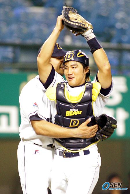 20일 두산 베어스와 현대 유니콘스의 잠실경기 현대의 4회초 2사 2루서 정성훈의 안타 때 중견수 임재철이 좋은 홈 송구로 2루 주자 서튼을 태그 아웃시켜 실점을 막자 두산 선발 투수 리오스가 포수 홍성흔을 껴안으며 좋아하고 있다./잠실= 주지영 기자 jj0jj0@osen.co.kr [Copyright ⓒ OSEN(www.osen.co.kr) 무단전재 및 재배포 금지]