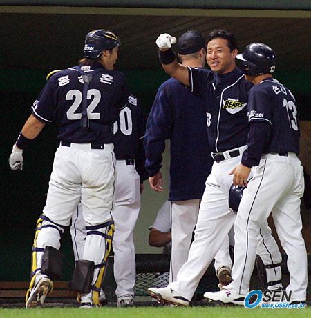 22일 SK 와이번스와 두산 베어스의 인천 경기 두산의 2회초 2사 1,2루서 김창희가 좌월 3점 홈런을 날리고 덕아웃으로 들어와 주먹을 높이 들며 기뻐하고 있다./인천=주지영 기자 jj0jj0@osen.co.kr [Copyright ⓒ OSEN(www.osen.co.kr) 무단전재 및 재배포 금지]