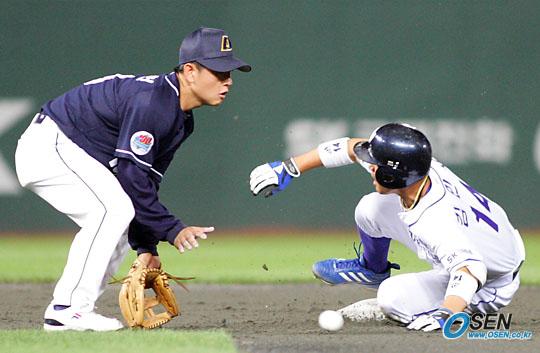 22일 SK 와이번스와 두산 베어스의 인천 경기 SK의 3회말 1사 후 우익수가 슬라이딩 캐치를 시도했으나 못잡는 안타를 날린 김민재가 잽싸게 2루까지 내달아 세이프되고 있다./인천=주지영 기자 jj0jj0@osen.co.kr [Copyright ⓒ OSEN(www.osen.co.kr) 무단전재 및 재배포 금지]