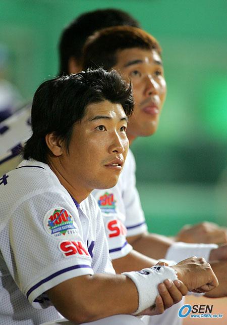 22일 SK 와이번스와 두산 베어스의 인천 경기 9회말 2사 후 0-6으로 뒤져 있는 SK의 박재홍(왼쪽)과 이호준이 덕아웃에서 안타까운 표정으로 경기를 바라보고 있다./인천=주지영 기자 jj0jj0@osen.co.kr [Copyright ⓒ OSEN(www.osen.co.kr) 무단전재 및 재배포 금지]