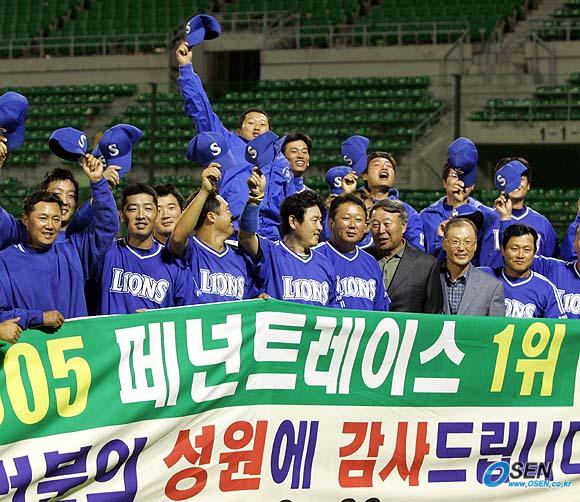 2005 페넌트레이스는 삼성의 우승으로 막을 내렸다. 삼성은 22일 광주에서 기아에 5-3으로 승리, 두산에 패한 2위 SK를 따돌리고 정규리그 1위를 확정지었다. 권오준 등 뒤에 있는 선수들이 자신들도 찍어 달라고 펄쩍 뛰고 있다./광주=손용호 기자 spjj@osen.co.kr [Copyright ⓒ OSEN(www.osen.co.kr) 무단전재 및 재배포 금지]