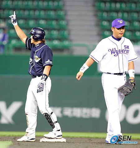 22일 SK 와이번스와 두산 베어스의 인천 경기 두산의 9회초 2사 1루서 중견수 쪽 깊숙한 안타를 날려 6-0을 만든 홍성흔이 오른손을 들며 기뻐하고 있다. SK 1루수 이호준이 안타까워 하는 모습과 대조를 이룬다./인천=주지영 기자 jj0jj0@osen.co.kr [Copyright ⓒ OSEN(www.osen.co.kr) 무단전재 및 재배포 금지]