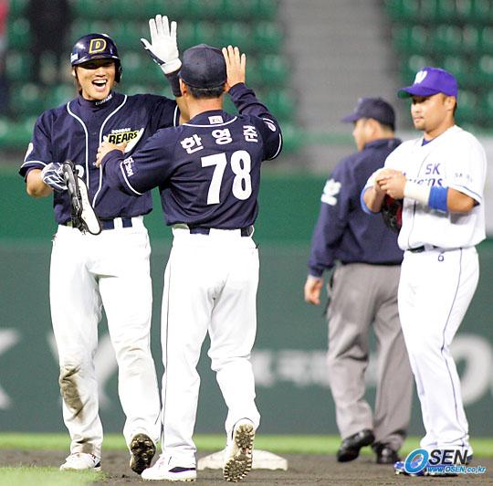 22일 SK 와이번스와 두산 베어스의 인천 경기 두산의 9회초 2사 1루서 중견수 쪽 깊은 2루타를 날려 6-0을 만든 홍성흔이 SK 2루수 정경배가 씁쓸히 바라보는 가운데 한영준 1루 코치와 하이파이브를 나누고 있다./인천=주지영 기자 jj0jj0@osen.co.kr [Copyright ⓒ OSEN(www.osen.co.kr) 무단전재 및 재배포 금지]