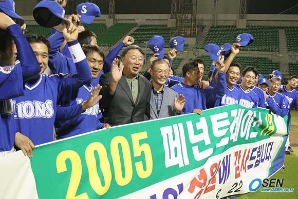 2005 페넌트레이스는 삼성의 우승으로 막을 내렸다. 삼성은 22일 광주에서 기아에 5-3으로 승리, 두산에 패한 2위 SK를 따돌리고 정규리그 1위를 확정지었다. 김응룡 사장(왼쪽에서 세 번째)이 선수들과 함께 기념사진을 찍고 있다./광주=손용호 기자 spjj@osen.co.kr [Copyright ⓒ OSEN(www.osen.co.kr) 무단전재 및 재배포 금지]