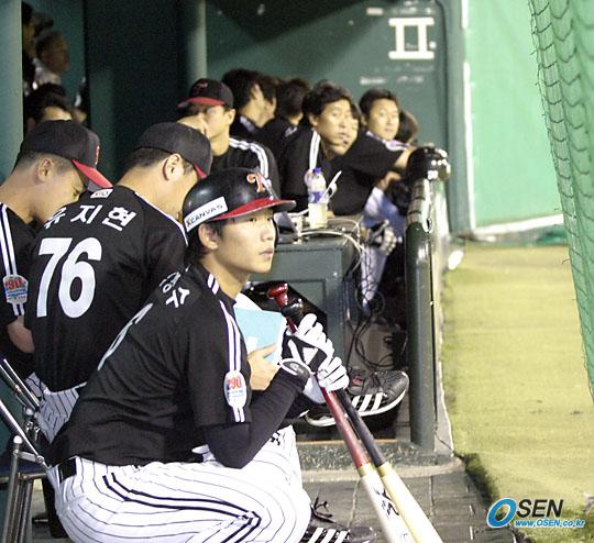 24일 현대 유니콘스와 LG 트윈스의 수원 경기가 시작하자마자 내린 폭우로 1회초 2사 후 중단됐다. LG 선수들이 덕아웃에서 빗방울을 지켜보고 있다./수원=주지영 기자 jj0jj0@osen.co.kr [Copyright ⓒ OSEN(www.osen.co.kr) 무단전재 및 재배포 금지]