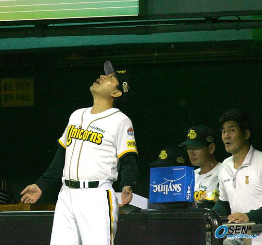 24일 현대 유니콘스와 LG 트윈스의 수원 경기가 시작하자마자 내린 폭우로 1회초 2사 후 중단되자 김재박 현대 감독이 덕아웃에서 나와 하늘을 바라보고 있다. /수원=주지영 기자 jj0jj0@osen.co.kr [Copyright ⓒ OSEN(www.osen.co.kr) 무단전재 및 재배포 금지]