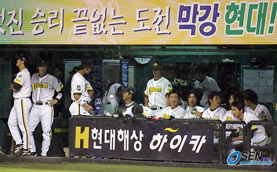 비로 경기가 중단돼 무료한 현대 덕아웃