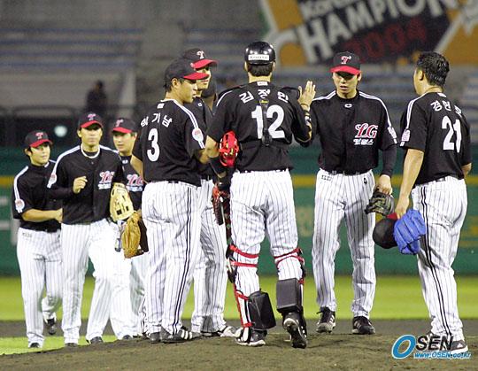 24일 현대 유니콘스와 LG 트윈스의 수원 경기서 4-3으로 신승한 LG 트윈스 선수들이 경기 후 마운드 주변에 모여 승리를 자축하고 있다. 7위 LG는 6위 현대에 반 게임 차로 접근, 남은 2경기를 모두 이기면 순위를 맞바꿀 수 있게 됐다./수원=주지영 기자 jj0jj0@osen.co.kr [Copyright ⓒ OSEN(www.osen.co.kr) 무단전재 및 재배포 금지]