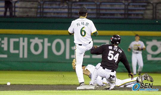 24일 현대 유니콘스와 LG 트윈스의 수원 경기 LG의 8회초 무사 1루서 이병규의 2루 쪽 깊은 땅볼 타구가 내야 안타가 되는 사이 1루 주자 클리어가 2루에 안착하고 있다./수원=주지영 기자 jj0jj0@osen.co.kr [Copyright ⓒ OSEN(www.osen.co.kr) 무단전재 및 재배포 금지]