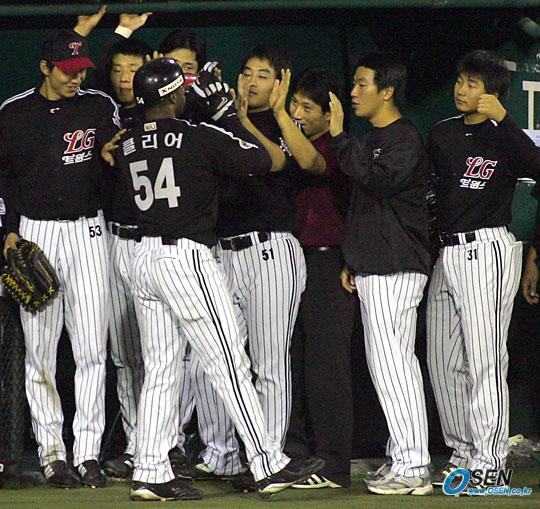 24일 현대 유니콘스와 LG 트윈스의 수원 경기 3회초 1사 후 클리어가 좌월 솔로 홈런을 날리고 들어와 동료들의 환영을 받고 있다./수원=주지영 기자 jj0jj0@osen.co.kr [Copyright ⓒ OSEN(www.osen.co.kr) 무단전재 및 재배포 금지]