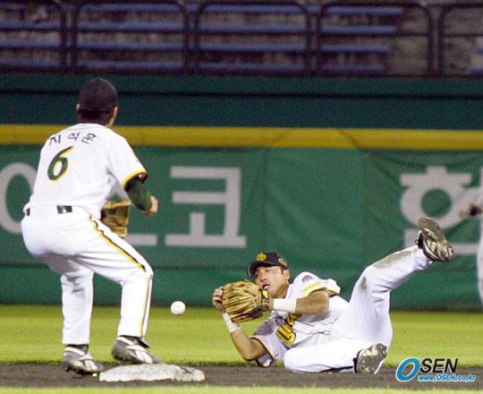 24일 현대 유니콘스와 LG 트윈스의 수원 경기 LG의 8회초 무사 1루서 이병규의 2루쪽 깊숙한 땅볼 타구를 현대 2루수 김승권(오른쪽)이 몸을 던져 잡는 듯했으나 놓치고 있다. 포구가 됐다면 2루에서 유격수 지석훈에게 포스 아웃됐을 1루 주자 클리어는 2루에 안착했고 이병규에게는 내야 안타가 주여졌다./수원=주지영 기자 jj0jj0@osen.co.kr [Copyright ⓒ OSEN(www.osen.co.kr) 무단전재 및 재배포 금지]