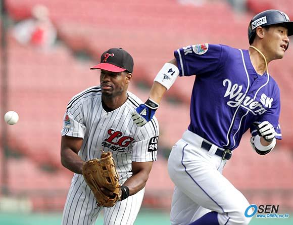 25일 잠실구장에서 벌어진 LG 트윈스와 SK 와이번스의 경기 SK의 3회초 무사 1루서 김민재의 보내기 번트 타구를 잡은 LG 1루수 클리어가 타자 주자를 태그하는 과정에서 공을 놓치는 실책을 범해 무사 1, 2루를 만들어주고 있다./잠실=손용호 기자 spjj@osen.co.kr [Copyright ⓒ OSEN(www.osen.co.kr) 무단전재 및 재배포 금지]