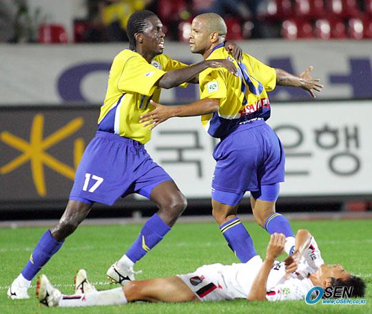25일 성남 제2종합운동장에서 벌어진 성남 일화와 부천 SK의 경기 후반 두두(오른쪽)가 1-1 동점이 되자마자 결승골을 시킨 뒤 히카르도와 함께 기뻐하고 있다. 부천의 신승호는 그라운드에 누워 허탈해 하고 있다./성남=주지영 기자 jj0jj0@osen.co.kr [Copyright ⓒ OSEN(www.osen.co.kr) 무단전재 및 재배포 금지]