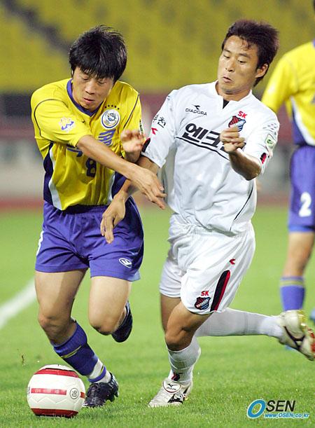 25일 성남 제2종합운동장에서 벌어진 성남 일화와 부천 SK의 경기서 성남의 김두현(왼쪽)이 부천의 신승호와 몸싸움을 벌이며 드리블하고 있다./성남=주지영 기자 jj0jj0@osen.co.kr [Copyright ⓒ OSEN(www.osen.co.kr) 무단전재 및 재배포 금지]