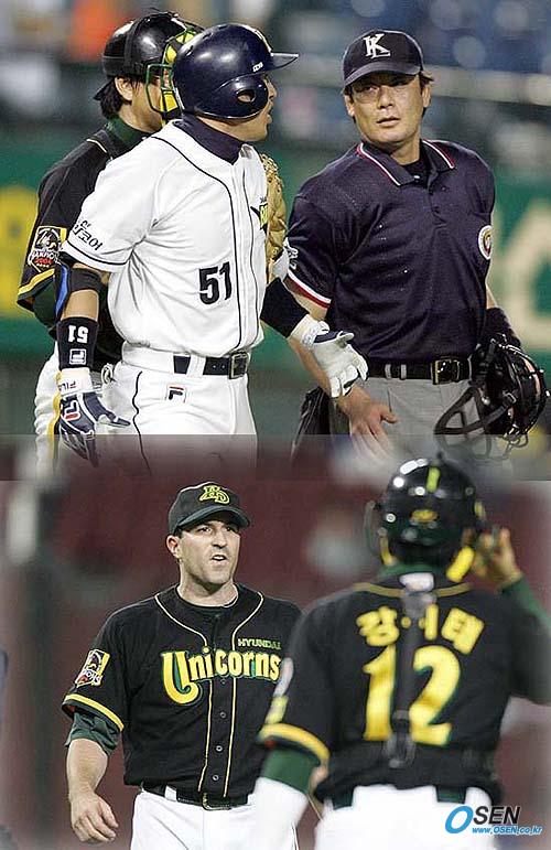 27일 잠실구장에서 벌어진 두산 베어스와 현대 유니콘스의 경기 두산의 4회말 1사 3루서 현대 선발 투수 캘러웨이의 투구에 맞은 최경환이 마운드로 갈 태세를 보이자(위 사진) 캘러웨이가 이에 질세라 소리를 지르며 팽팽한 신경전을 벌이고 있다(아래 사진)./잠실=손용호 기자 spjj@osen.co.kr [Copyright ⓒ OSEN(www.osen.co.kr) 무단전재 및 재배포 금지]