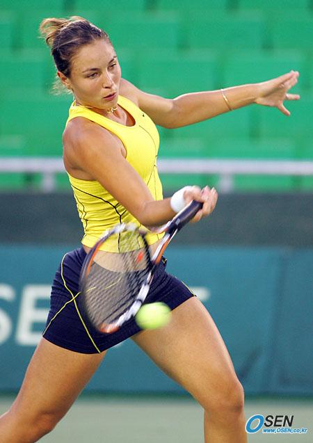27일 서울 올림픽공원 테니스경기장에서 벌어진 2005 한솔코리아오픈 여자 단식 본선 1회전서 세비린 브레몽이 이번 대회 톱 시드인 엘레나 얀코비치에게 포핸드로 공격하고 있다. 얀코비치가 6-3, 6-1로 승리했다./올림픽공원= 주지영 기자 jj0jj0@osen.co.kr [Copyright ⓒ OSEN(www.osen.co.kr) 무단전재 및 재배포 금지]