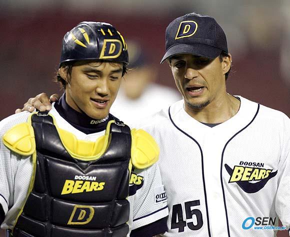 27일 잠실구장에서 벌어진 두산 베어스와 현대 유니콘스의 경기서 두산의 선발 투수인 리오스가 2회초 수비를 가볍게 마치고 포수 홍성흔과 어깨동무를 하고 덕아웃으로 향하고 있다. 리오스는 준플레이오프를 대비해 3이닝만 던져 3피안타 2볼넷 무실점으로 막았다./잠실=손용호 기자 spjj@osen.co.kr [Copyright ⓒ OSEN(www.osen.co.kr) 무단전재 및 재배포 금지]