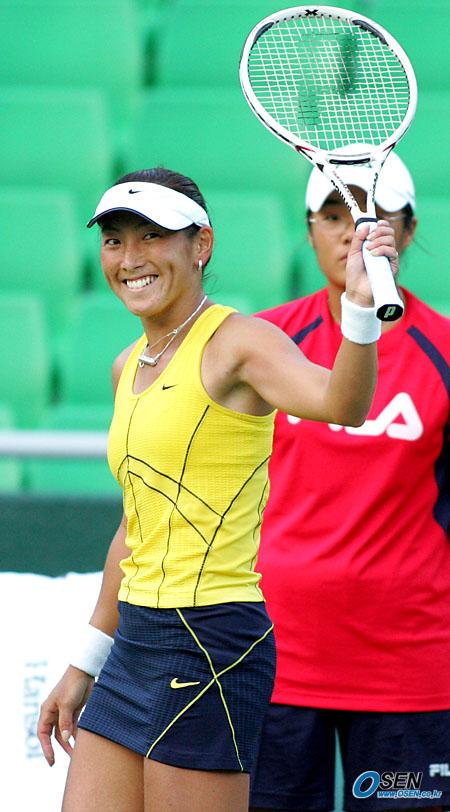 27일 서울 올림픽공원 테니스경기장에서 벌어진 2005 한솔코리아오픈 여자 단식 본선 1회전서 일본의 스기야마 아이(세계 32위)가 미국의 질 크레이바스(57위)와 접전을 벌인 끝에 5-7, 6-3, 6-0으로 역전승을 거둔 뒤 관중석을 향해 라켓을 들어 보이며 웃고 있다./올림픽공원= 주지영 기자 jj0jj0@osen.co.kr [Copyright ⓒ OSEN(www.osen.co.kr) 무단전재 및 재배포 금지]
