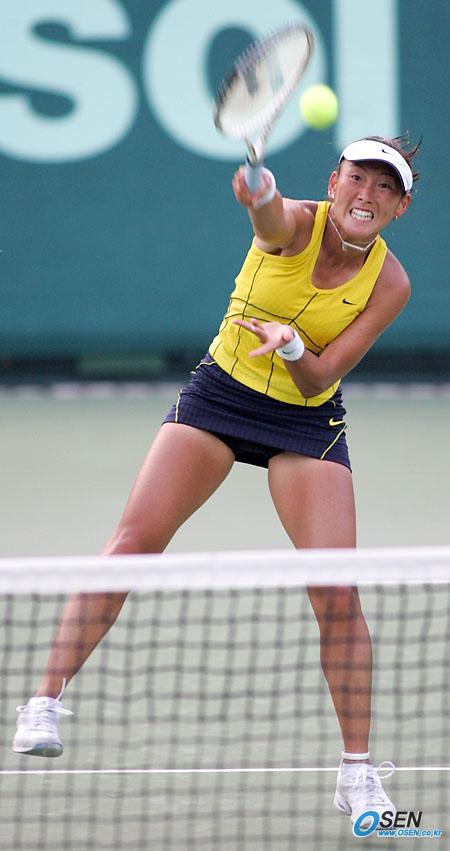 27일 서울 올림픽공원 테니스경기장에서 벌어진 2005 한솔코리아오픈 여자 단식 본선 1회전서 일본의 스기야마 아이(세계 32위)가 미국의 질 크레이바스(57위)에게 네트 근처서 강한 스매싱을 넣고 있다. 스기야마가 접전 끝에 5-7, 6-3, 6-0으로 역전승했다./올림픽공원= 주지영 기자 jj0jj0@osen.co.kr [Copyright ⓒ OSEN(www.osen.co.kr) 무단전재 및 재배포 금지]