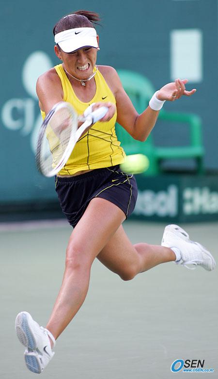 27일 서울 올림픽공원 테니스경기장에서 벌어진 2005 한솔코리아오픈 여자 단식 본선 1회전서 일본의 스기야마 아이(세계 32위)가 미국의 질 크레이바스(57위)의 공격을 재빨리 따라가 받아 넘기지 못하고 있다. 스기야마가 접전 끝에 5-7, 6-3, 6-1로 역전승했다./올림픽공원= 주지영 기자 jj0jj0@osen.co.kr [Copyright ⓒ OSEN(www.osen.co.kr) 무단전재 및 재배포 금지]