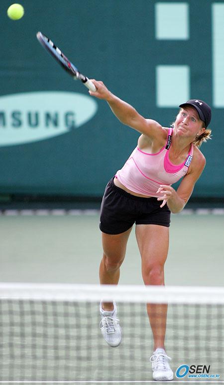 27일 서울 올림픽공원 테니스경기장에서 벌어진 2005 한솔코리아오픈 여자 단식 본선 1회전서 미국의 질 크레이바스(세계 57위)가 팔을 틀어 스매싱하며 일본의 스기야마 아이(세계 32위)를 공격하고 있다. 스기야마가 접전 끝에 5-7, 6-3, 6-1로 역전승했다./올림픽공원= 주지영 기자 jj0jj0@osen.co.kr [Copyright ⓒ OSEN(www.osen.co.kr) 무단전재 및 재배포 금지]