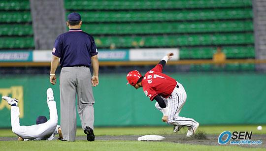 28일 두산 베어스와 기아 타이거즈의 잠실 경기 기아의 3회초 1사 1루 이용규 타석서 이종범(오른쪽)이 2루 도루를 시도했을 때 두산 포수 홍성흔의 송구가 베이스 뒤으로 빠지고 있다. 유격수 손시헌은 그라운드에 엎어져 있고 이종범은 탄력을 받아 2루를 돌았으나 3루까지 가는 것은 무리라고 판단, 귀루했다./잠실= 주지영 기자 jj0jj0@osen.co.kr [Copyright ⓒ OSEN(www.osen.co.kr) 무단전재 및 재배포 금지]