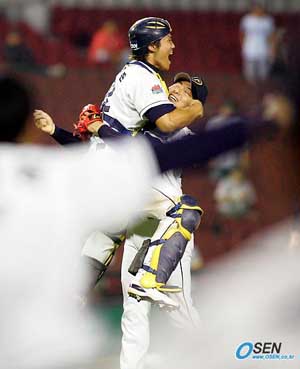 두산이 기적을 이뤄냈다. 8월 16일부터 한달 넘게 SK에 뒤져 3위를 달려오던 두산이 페넌트레이스 최종일 막판 뒤집기로 플레이오프 직행 티켓을 따냈다. 28일 잠실구장에서 펼쳐진 기아와 페넌트레이스 마지막 경기에서 1회와 3~5회 그리고 7회 또 점수를 내는 등 매서운 집중력으로 기아를 7-2로 꺾었다. 6연승으로 시즌을 마감한 두산은 72승 51패 3무로 LG에 2-.3 한점차로 패한 SK를 반게임차로 제치고 2위로 플레이오프에 직행했다. 김동주와 김창희 장원진 등 주전들이 대거 부상으로 빠졌지만 곰돌이들은 매섭게 방망이를 휘둘렀다. 1회 최경환 홍성흔의 안타로 선취점을 낸 두산은 2회엔 문희성의 안타와 홍성흔의 행운의 스트라이크아웃 낫아웃 등으로 만든 2사 만루에선 안경현이 기아 선발 김진우에게 밀어내기 몸에 맞는 공을 얻어냈다. 두산은 4회 김상훈의 2루타와 김종국의 희생 플라이로 2-1로 쫓겼지만 곧이은 4회말과 5회 내리 점수를 만들어 달아났다. 4회엔 전상렬의 2루타로 만든 1사 3루에서 전상렬이 초구 기습적인 스퀴즈번트를 성공시켰고 5회엔 1사 만루에서 나주환의 희생 플라이로 4-1로 달아났다. 금민철-김성배-이재우-정재훈으로 이어지는 마운드 총력전을 펼친 두산은 6회 이재우가 2사 2루에서 김상훈에게 적시타를 맞아 다시 두점차로 쫓기며 절체절명의 위기를 넘겼다. 계속된 2사 1루에서 김종국이 친 타구가 왼쪽 파울 폴 옆 펜스 상단의 '100m' 거리 사인을 직접 맞혀 간발의 차로 홈런이 아닌 안타가 된 것. 2사 1,3루에서 이제우는 장일현을 내야 뜬 공으로 잡고 위기를 탈출했다. 두산은 7회 최경환의 2타점 적시타 등 안타 4개로 3점을 보태 승부를 결정지었다. LG전 9연승을 달려온 SK는 현대를 제치고 6위로 시즌을 마감하려는 쌍둥이들에게 발목을 잡혀 마지막 날 고개를 떨궜다. 1회 박경수와 박재홍이 솔로홈런을 주고받으며 1-1의 평행선이 시작됐지만 LG가 이를 먼저 깼다. 6회 정의윤 이병규가 SK 선발 크루즈에 이어 3회 등판한 신승현을 연속 안타로 두들겨 무사 1,2루를 만든 뒤 대타 안치용이 스리번트까지 감행해 주자를 한 베이스씩 진루시켰다. 다음 타자 최길성이 곧바로 중견수 희생 플라이를 터뜨렸다. 7회 발빠른 이대형의 도루에 이은 박경수의 적시타로 한점을 더 내준 SK는 7회 정경배의 2루타로 다시 2-3 한점차로 따라붙었지만 8회 결정적인 기회를 놓쳐 결국 땅을 쳤다. 선두타자 박재홍이 안타를 치고나간 뒤 보내기 번트로 1사 2루에서 LG 유격수 권용관의 3루 송구 실책으로 1사 1,3루로 기사회생했지만 이호준이 왈론드에게 5-4-3으로 이어지는 3루앞 병살타로 물러나고 말았다. 두산 2위, SK 3위, LG 6위, 현대 7위로 페넌트레이스를 마감한 프로야구는 10월 1일부터 SK-한화의 5전3선승 준플레이오프로 포스트시즌의 막을 연다. 1~3차전은 SK의 홈 문학구장에서 4~5차전(필요할 경우)은 대전구장에서 열린다. 잠실=이종민 기자 mini@osen.co.kr 28일 기아를 꺾고 2위로 올라서는 순간 홍성흔이 마무리 투수 정재훈에게 달려가 올라타며 기뻐하고 있다. [Copyright ⓒ OSEN(www.osen.co.kr) 무단전재 및 재배포 금지]