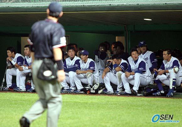 SK 와이번스가 28일 문학구장에서 벌어진 LG 트윈스와의 시즌 최종전서 2-3으로 패해 잠실구장에서 벌어진 경기서 기아를 꺾은 두산에 페넌트레이스 마지막 날 2위를 내주고 3위가 되고 말았다. 9회말 2사 후 박경완이 내야 플라이로 아웃되자 덕아웃에 앉아있는 SK 선수들이 아쉬움을 감추지 못하고 있다./인천=손용호 기자spjj@osen.co.kr [Copyright ⓒ OSEN(www.osen.co.kr) 무단전재 및 재배포 금지]