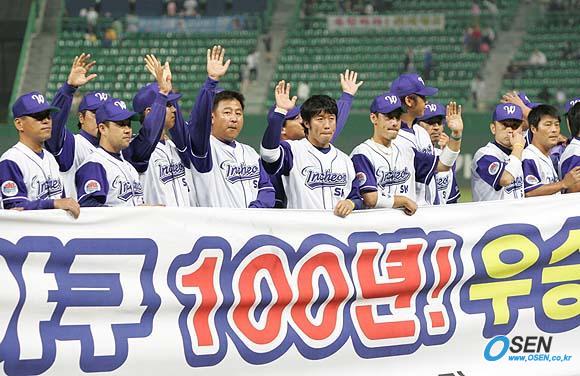 SK 와이번스가 28일 문학구장에서 벌어진 LG 트윈스와의 시즌 최종전서 2-3으로 패해 잠실구장에서 벌어진 경기서 기아를 꺾은 두산에 페넌트레이스 마지막 날 2위를 내주고 3위가 되고 말았다. SK 선수들이 아쉬운 표정으로 관중들에게 '포스트시즌서 더 잘하겠다'는 인사를 하고 있다./인천=손용호 기자 spjj@osen.co.kr [Copyright ⓒ OSEN(www.osen.co.kr) 무단전재 및 재배포 금지]