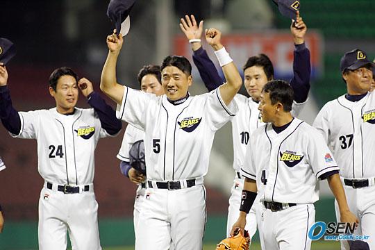 28일 기아 타이거즈와의 잠실 경기서 7-2로 이겨 이날 LG에 덜미를 잡힌 SK를 3위로 끌어내리며 플레이오프에 직행한 두산 베어스 선수들이 경기 후 싱글벙글한 표정으로 관중석에 인사하고 있다./잠실= 주지영 기자 jj0jj0@osen.co.kr [Copyright ⓒ OSEN(www.osen.co.kr) 무단전재 및 재배포 금지]