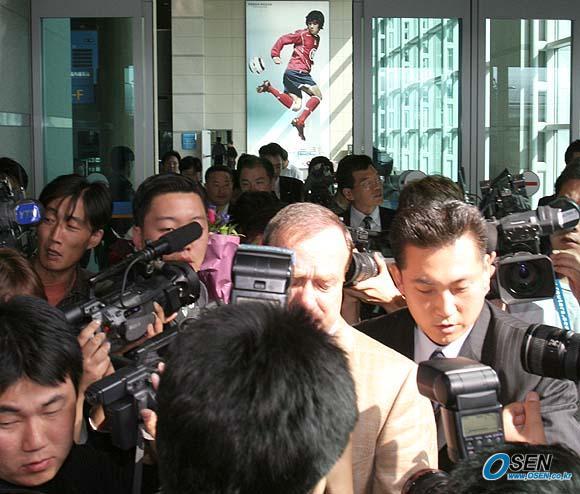 한국 축구대표팀을 새로 이끌게 된 '네덜란드 듀오' 딕 아드보카트 감독과 핌 베어벡 수석코치가 29일 오전 인천공항을 통해 입국했다. 아드보카드 감독이 많은 취재진에 쌓여 공항을 빠져 나가는 뒤로 박주영의 대형 광고 사진이 걸려 있다./인천공항=손용호 기자 spjj@osen.co.kr [Copyright ⓒ OSEN(www.osen.co.kr) 무단전재 및 재배포 금지]