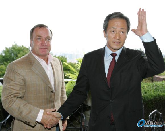 29일 오전 입국한 아드보카트 감독이 서울 하얏트 호텔 양식당에서 정몽준 대한축구협회장과 조우했다. 이 자리는 아드보카트 감독과 코칭스태프의 점심 식사 자리였지만 마침 이 호텔에서 약속이 있던 정 회장이 찾아와 만남이 이루어졌다. 정 회장과 아드보카트 감독이 악수를 나누고 있다./하얏트호텔=손용호 기자spjj@osen.co.kr [Copyright ⓒ OSEN(www.osen.co.kr) 무단전재 및 재배포 금지]