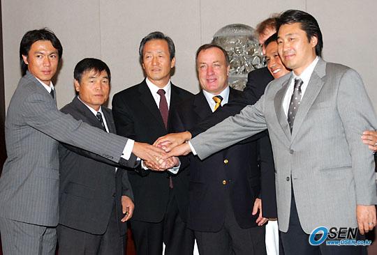 29일 저녁 서울 신라호텔에서 딕 아드보카트 신임 국가대표팀 감독 환영 만찬이 열렸다. 홍명보 코치, 이회택 대한축구협회 기술위원장, 정몽준 회장, 베어벡 수석코치, 김주성 이사, 강신우 기술국장(왼쪽으로부터)이 손을 한데 모으고 2006 독일월드컵서의 성공을 다짐하고 있다./신라호텔=주지영 기자 jj0jj0@osen.co.kr [Copyright ⓒ OSEN(www.osen.co.kr) 무단전재 및 재배포 금지]